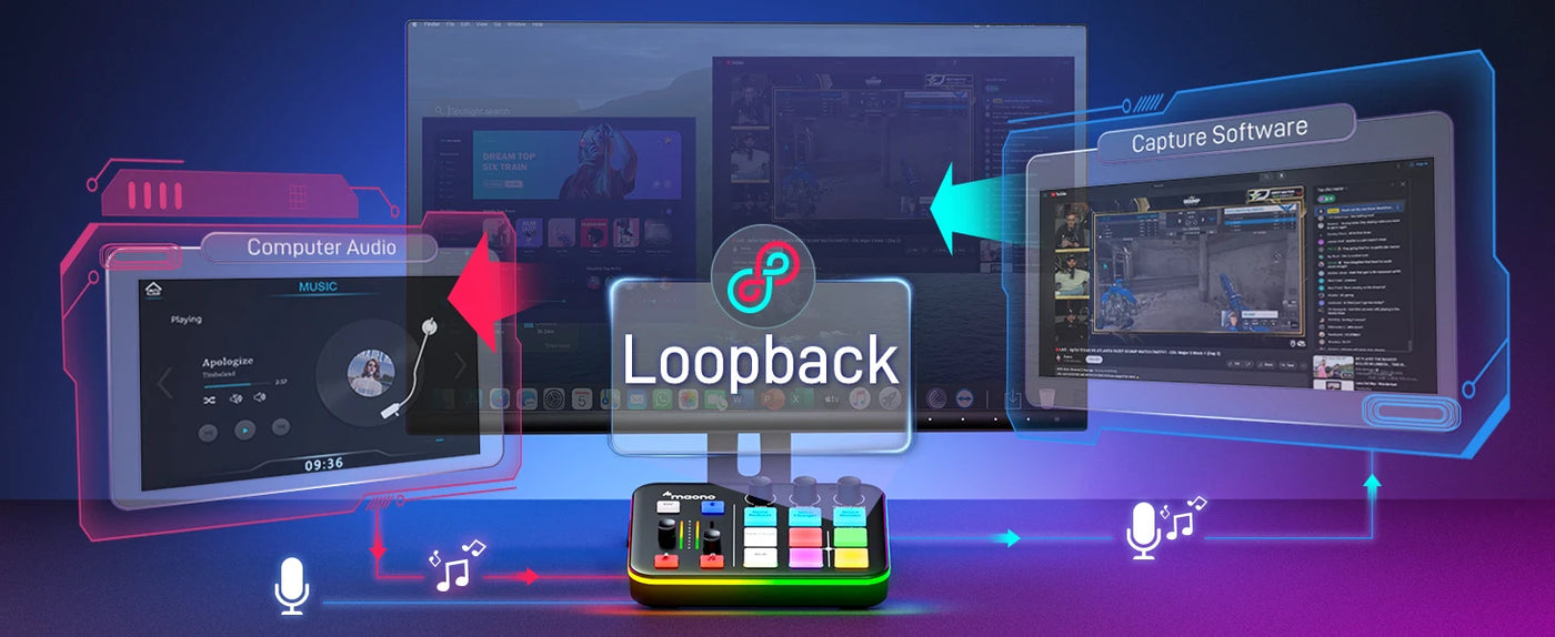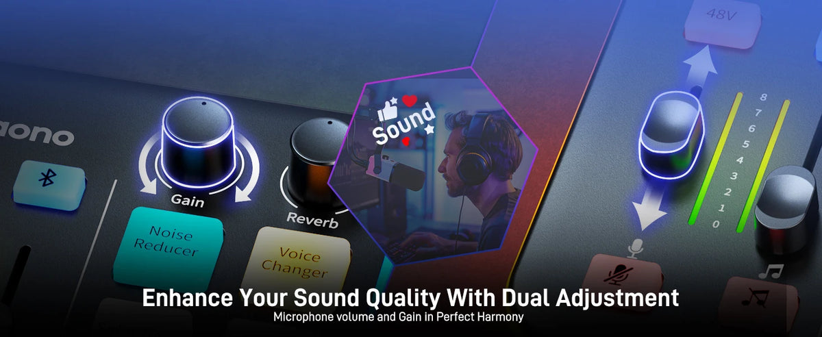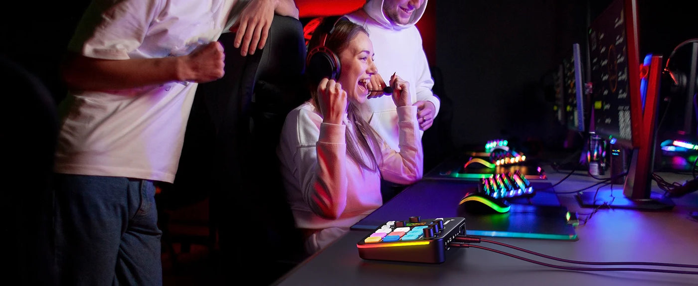 Professional gaming audio mixer with customizable sound effects and RGB lighting